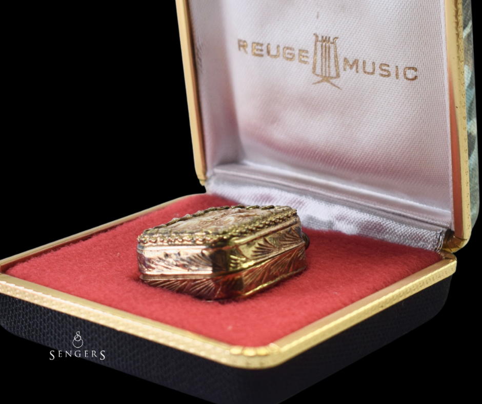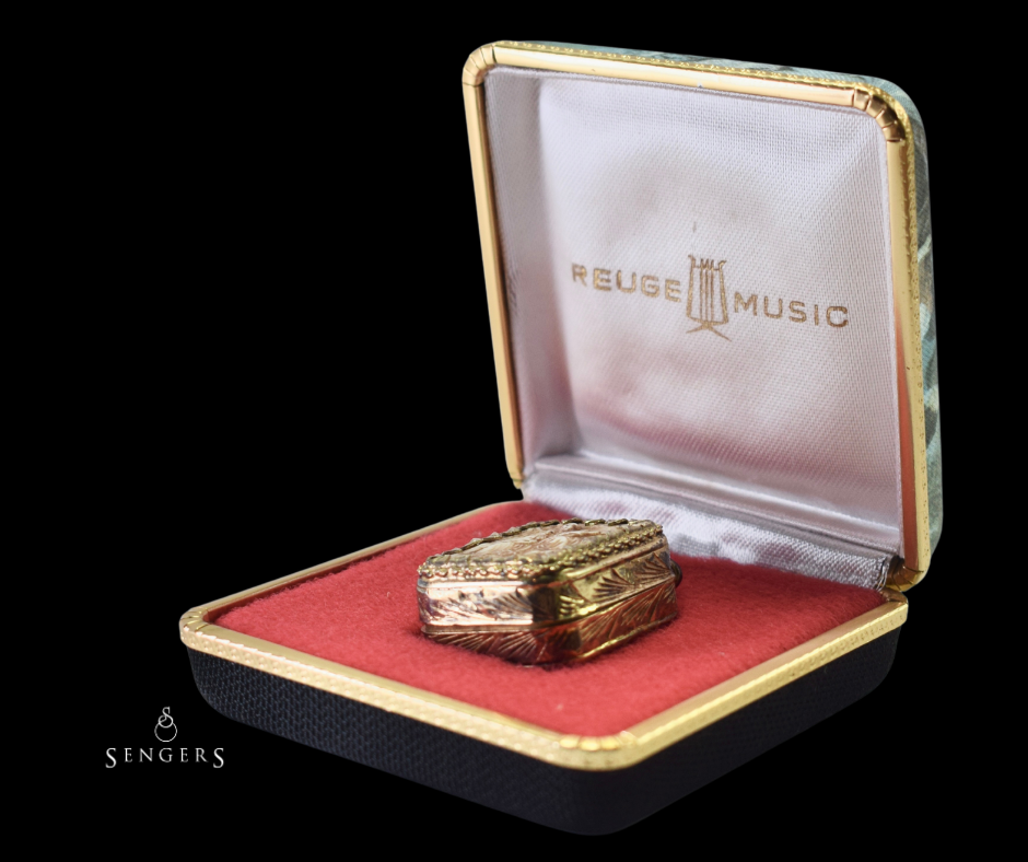 Het originele etui benadrukt dat dit sieraad werd gezien als iets waardevols dat zorgvuldig werd bewaard. Samen vormen hanger en etui een compleet geheel, dat niet alleen iets vertelt over smaak en techniek, maar ook over hoe objecten een plek kregen in het dagelijks leven.