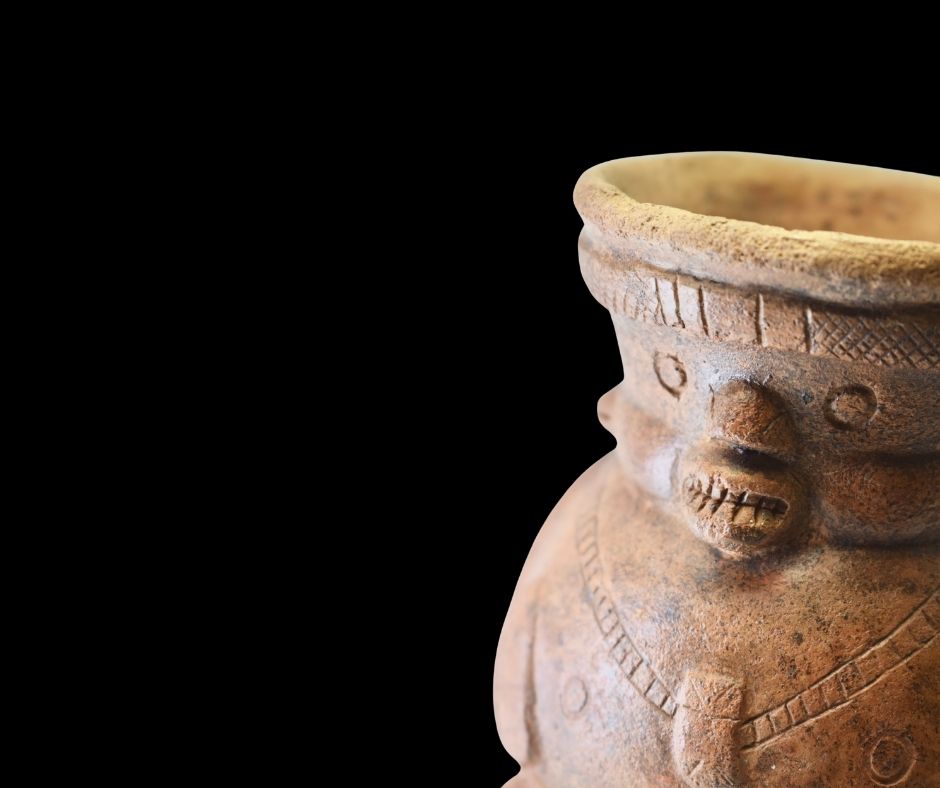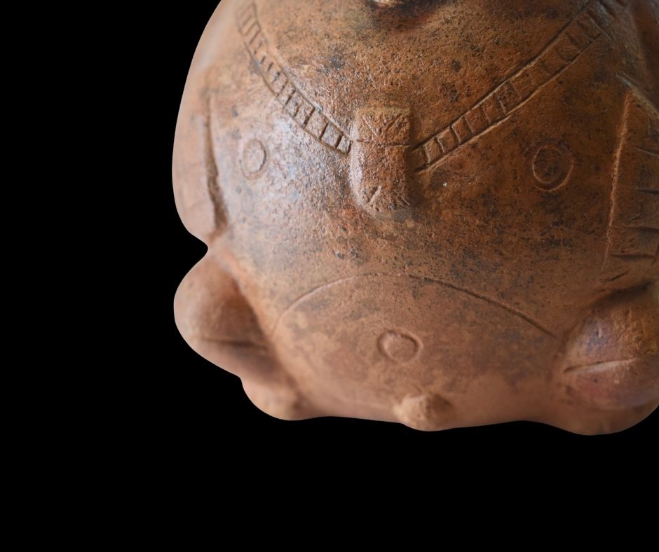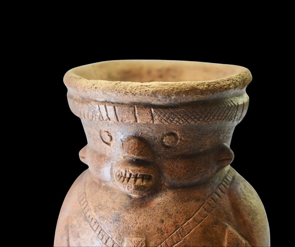 Uniek pré-Columbiaans kannetje in de vorm van een gehurkt figuur, gemaakt uit aardewerk. Het object is gevonden in het Departamento del Valle del Cauca in Peru en dateert tussen 1000 en 100 jaar vóór Christus. Dit zeldzame stuk komt met certificaat en vormt een werkelijke verbinding met een verdwenen cultuur.