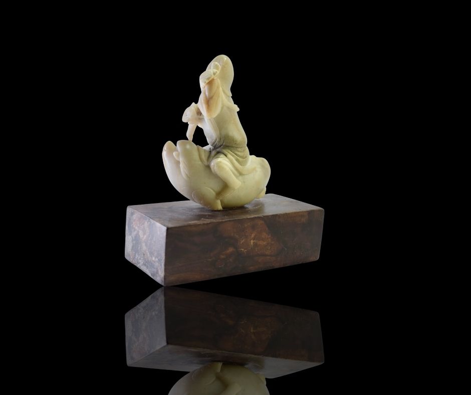 Uit speksteen gesneden voorstelling van een kind met schildpad, zittend op een mythisch dier. In de Chinese beeldtaal staan zowel de schildpad als de hersenschim symbool voor wijsheid en een lang leven. Een speels, maar tegelijk betekenisvol beeldje uit de late Ming- of vroege Qing-periode.
