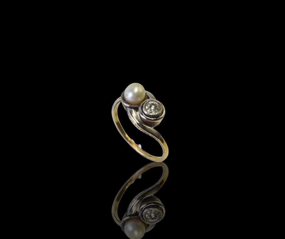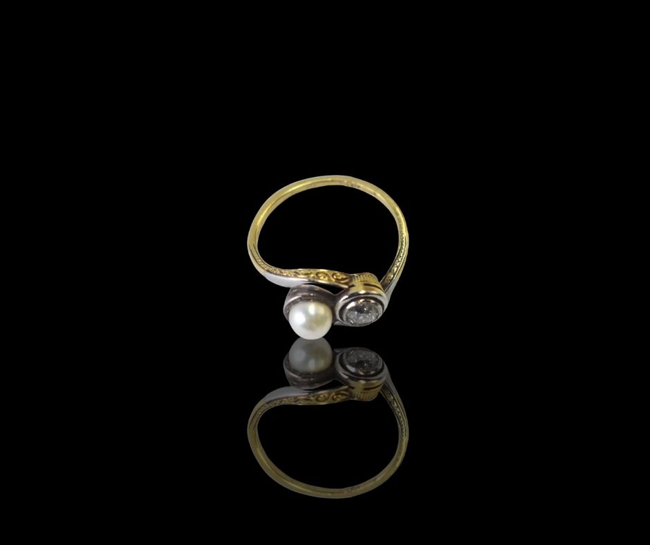 Een prachtige ring uit de Art Nouveau-periode, met een parel en een fonkelende briljant in oud slijpsel. Elegant, vrouwelijk en uniek… Het is een mooi voorbeeld van hoe sieraden rond 1900 werden vormgegeven, waarin elegantie en natuurlijke vormen hand in hand gingen.