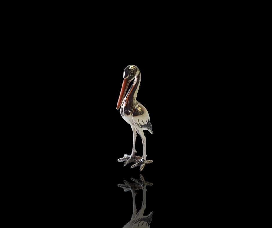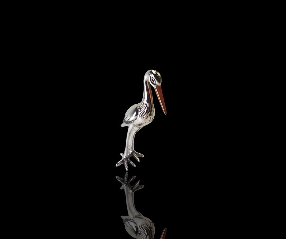 Een zilveren miniatuur van een ooievaar, met een fel gekleurde geëmailleerde snavel. De ooievaar is al eeuwenlang verbonden met geboorte en nieuw leven. Dit maakt het tot een charmant en symbolisch object, zowel verzamelwaardig als betekenisvol. Het is een ideaal geboorte kado!