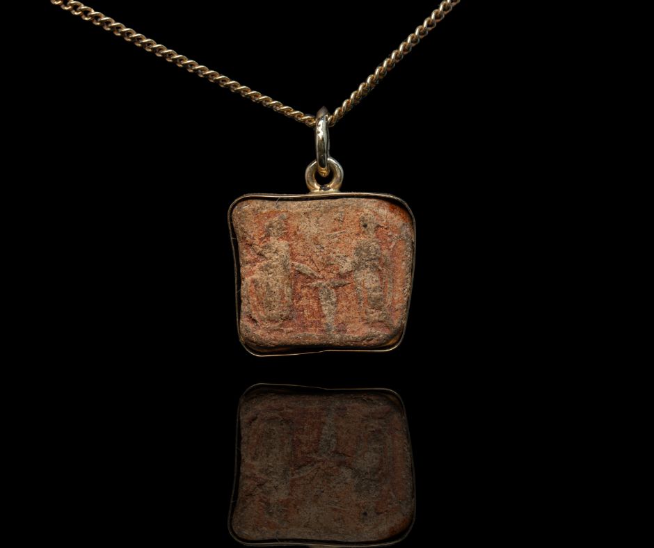 Oost-Romeinse Rijk, zgn. tessera (theaterpenning), verwerkt tot hanger, €750 (met certificaat), aan een 14 krt gouden gourmet collier, €495.