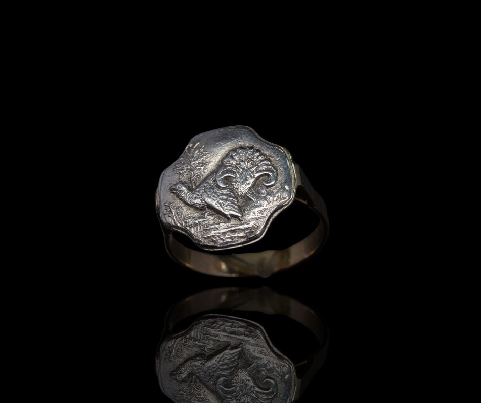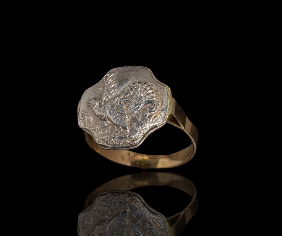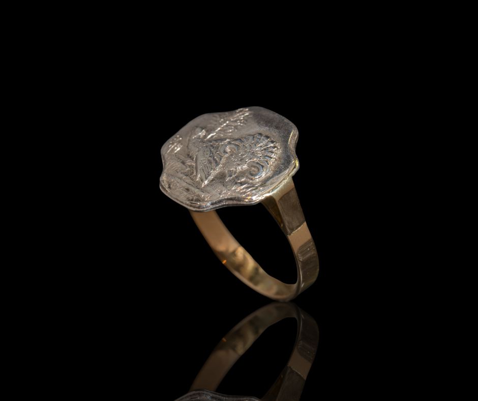 14 krt gouden handgemaakte ring met zilveren afbeelding van een korhoen