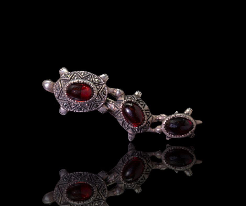 Drie kleine schildpadjes, uitgevoerd in zilver en bezet met granaten. Speels van karakter, met een rijke kleurwerking door de mooie diepe kleur van de granaten.