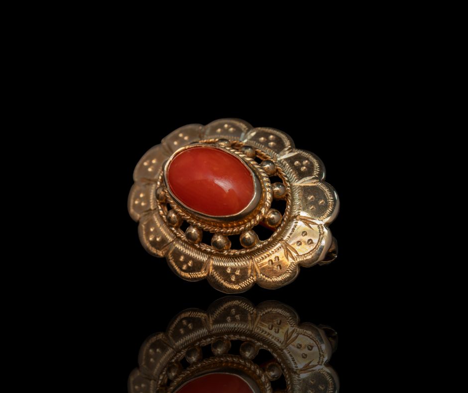 Broche in 14 karaat goud, bezet met bloedkoraal. Het koraal heeft een diepe rode tint en vormt het centrale element van het ontwerp.