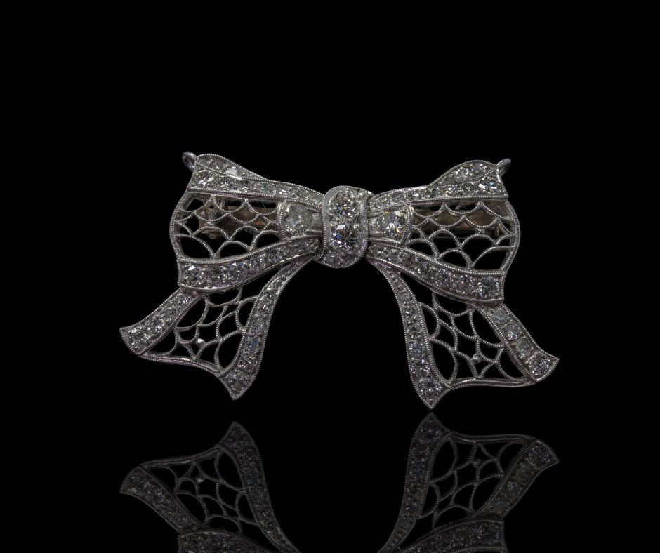 Strikvormige broche die ook als hanger gedragen kan worden. Uitgevoerd in 14 krt witgoud en bezet met vier grotere briljanten van ca. 0.15 ct en daarnaast een geheel van kleinere diamanten (totaal ca. 1.50 ct). Een mooi elegant sieraad voor wie van een beetje sprankeling houdt.