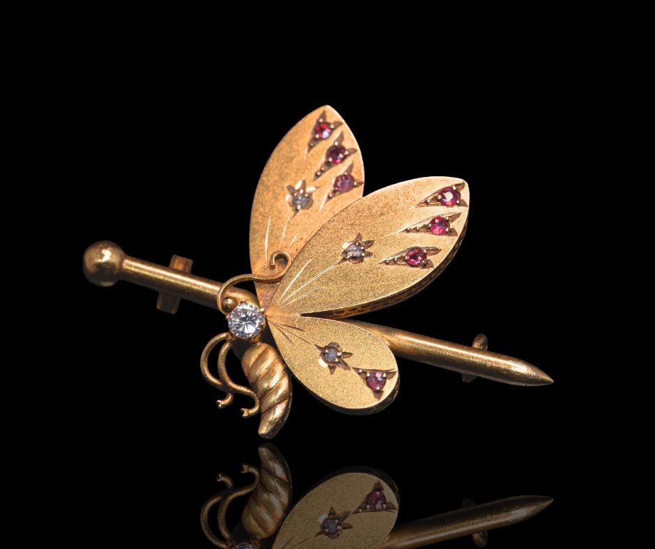 Broche in 18 karaat goud in de vorm van een vlinder, bezet met een briljant en robijnen. Frans werk, circa 1910. Op de broche spreken de robijnen prachtig, en op het lijfje van de vlinder komt de diamant goed naar voren.