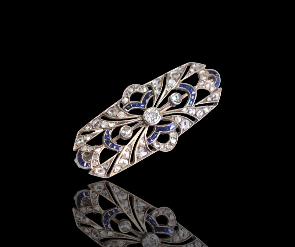 Een sierlijke antieke broche uit de Art Deco-periode, rijk bezet met diamanten, briljanten en prachtige blauwe saffieren. De strakke lijnen en edelstenen combinatie maken dit tot een uitzonderlijk stuk dat zowel verzamelaars als liefhebbers van alle soorten juwelen zal aanspreken.