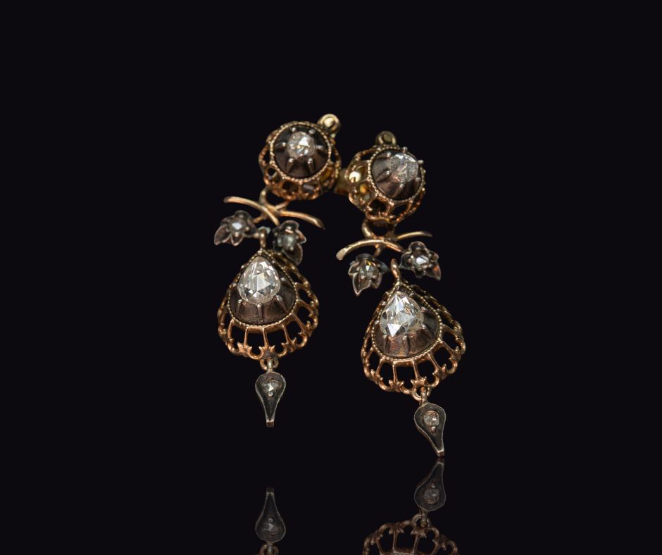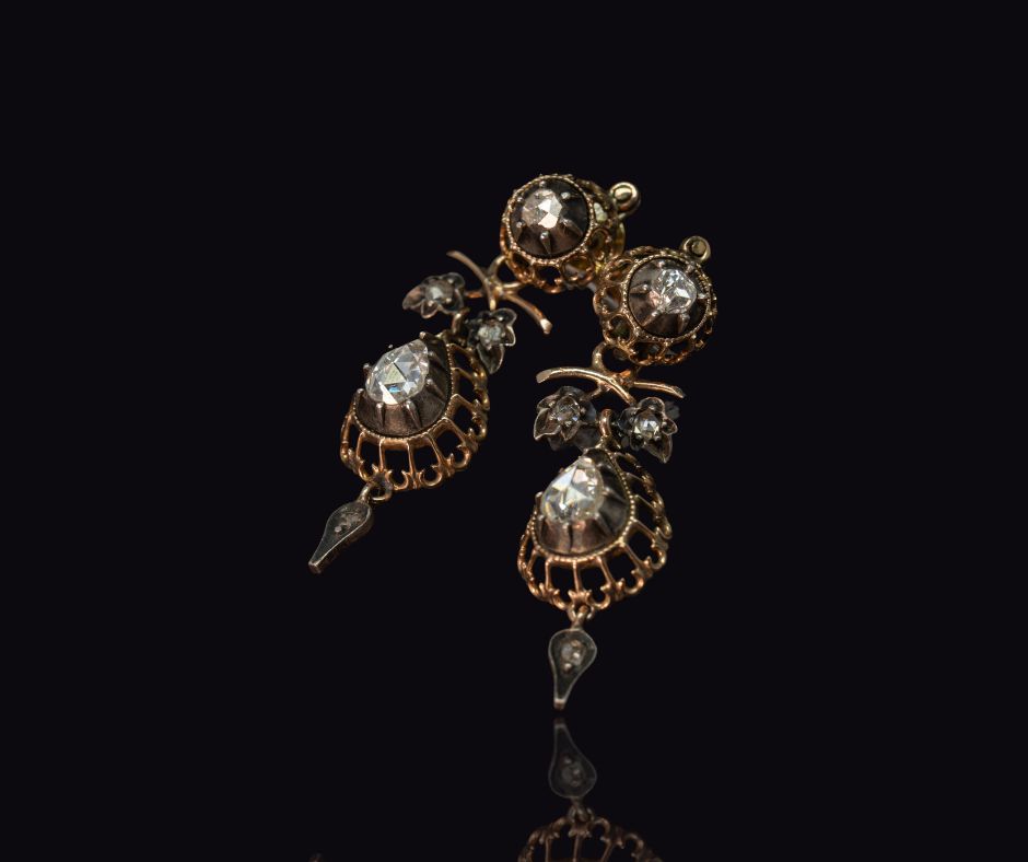 Antieke oorhangers van 14 karaat goud, voorzien van roosgeslepen diamanten die in zilver zijn gezet. De oorhangers zijn bezet met roosgeslepen diamanten, een slijpvorm die vooral werd toegepast van de 16de tot en met de 19de eeuw. In tegenstelling tot moderne briljantslijpsels hebben roosgeslepen diamanten een platte onderzijde en een koepelvormige bovenzijde, opgebouwd uit driehoekige facetten. De combinatie van goud en zilver is typerend voor oudere diamantzettingen en benadrukt het karakter van de stenen.