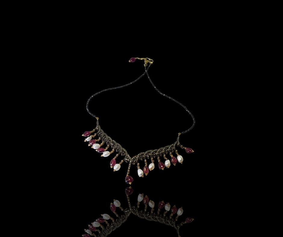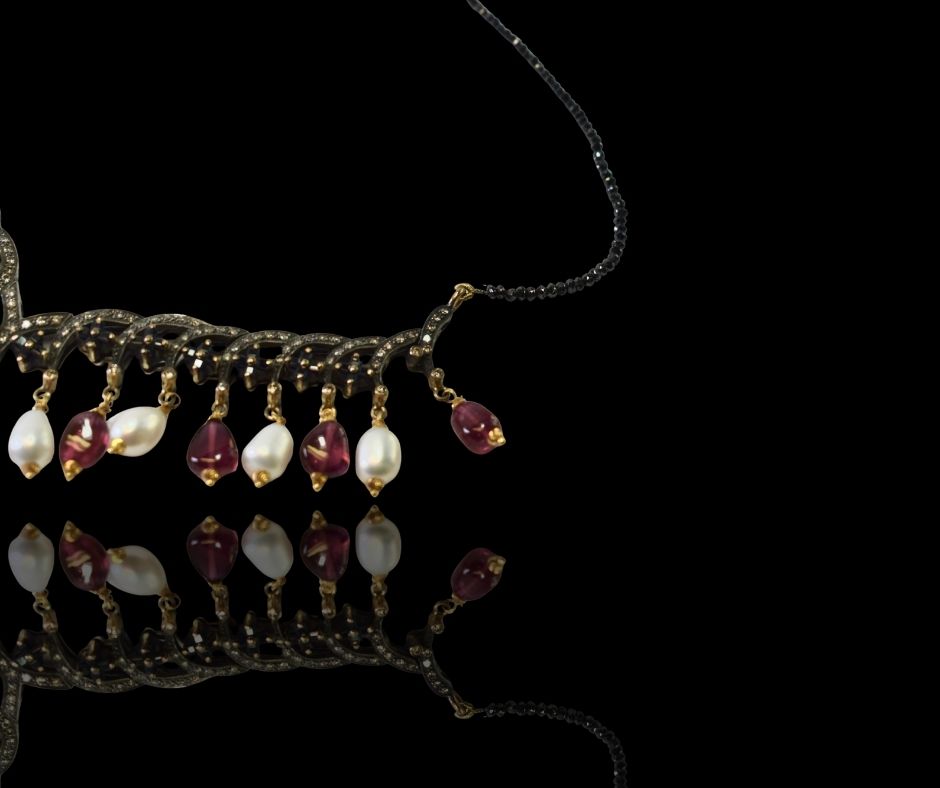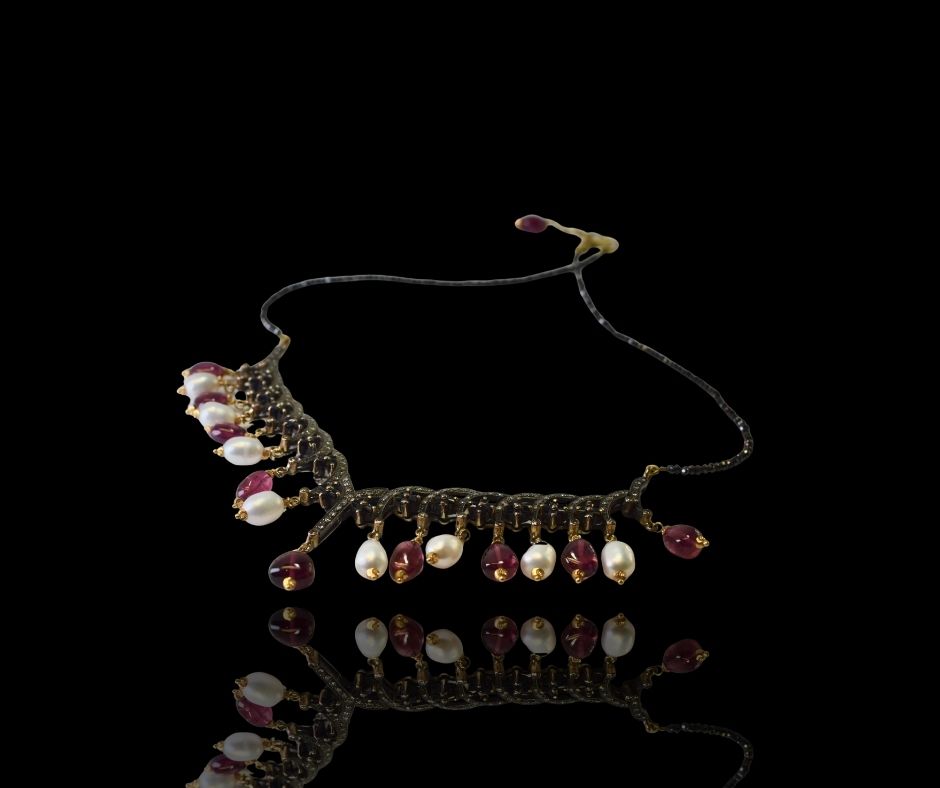 Een zilveren schakelcollier, bezet met briljanten en zwarte diamanten. Afgewerkt met 18 karaat gouden pampels waarin toermalijnen en parels verwerkt zijn. Het is een werkelijk opvallend juweel dat door het unieke ontwerp een ware blikvanger vormt.