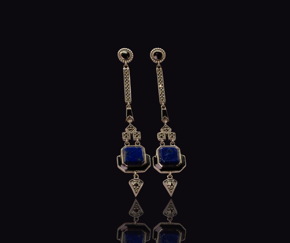 Paar geometrische zilveren oorhangers met lapis lazuli. De intense kleur van de stenen geeft de oorhangers een duidelijke uitstraling, en zullen een echt ‘eye catcher’ zijn!