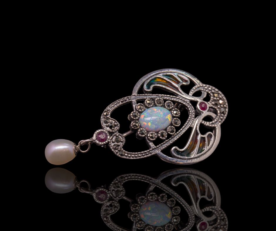 Kleine broche waarin opaal, parel en emaille zijn gecombineerd. De materialen sluiten aan bij de voorkeur voor zachte kleuren en organische vormen binnen het Art Nouveau.