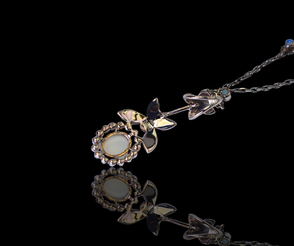 Een zilveren hanger bezet met opaal en parels, gecombineerd met een collier van kleine opalen. Een zachte en elegante hanger, waarbij de parels en het opaal elkaar versterken.