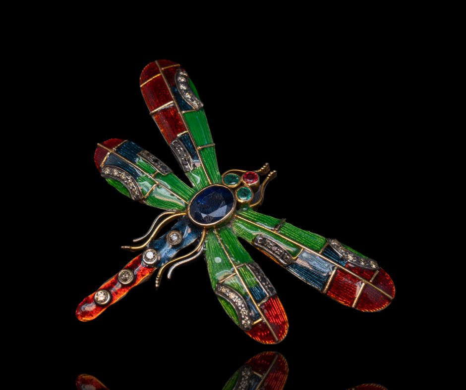 Speelse libelle, uitgevoerd in goud en zilver. De vleugels zijn afgewerkt met emaille en ingelegd met smaragd, robijn, saffier en briljanten. Door de combinatie van kleur en materiaal voelt het stuk levendig en licht.
