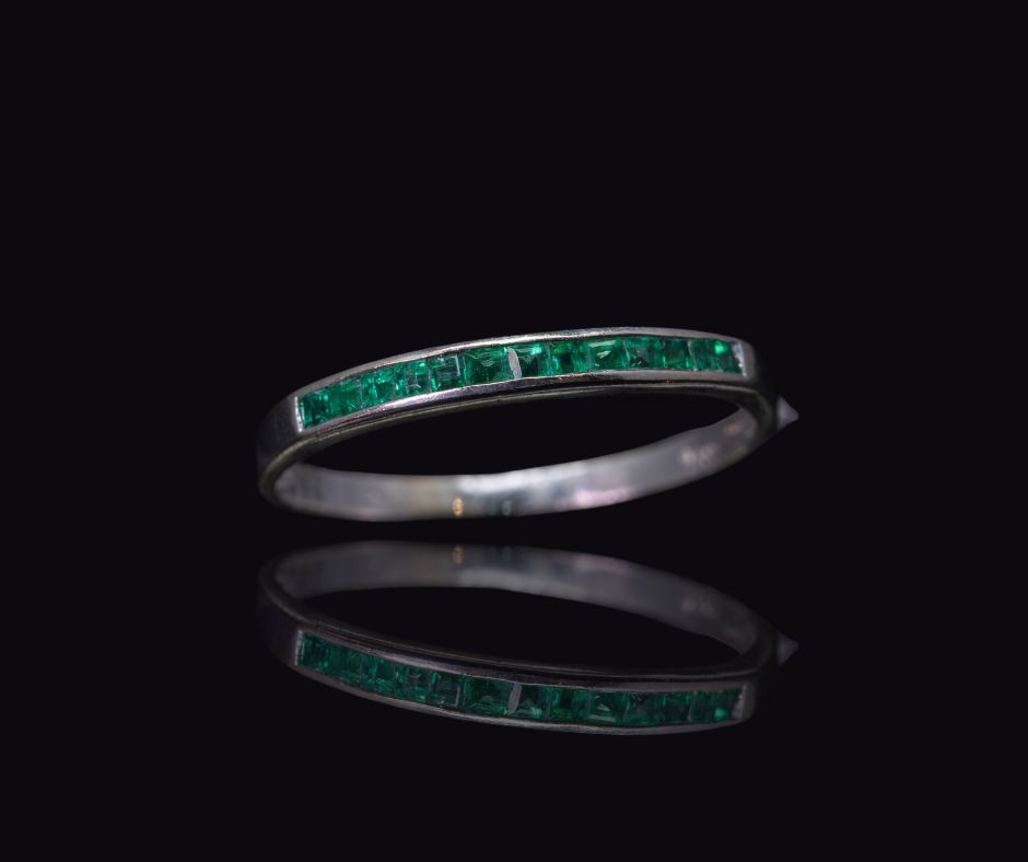 Gouden rijring, bezet met smaragden. Door de gelijkmatige plaatsing van de stenen komt de intense groene kleur van de smaragd goed tot zijn recht. Het ontwerp is helder en evenwichtig, waardoor de focus volledig op de stenen ligt.