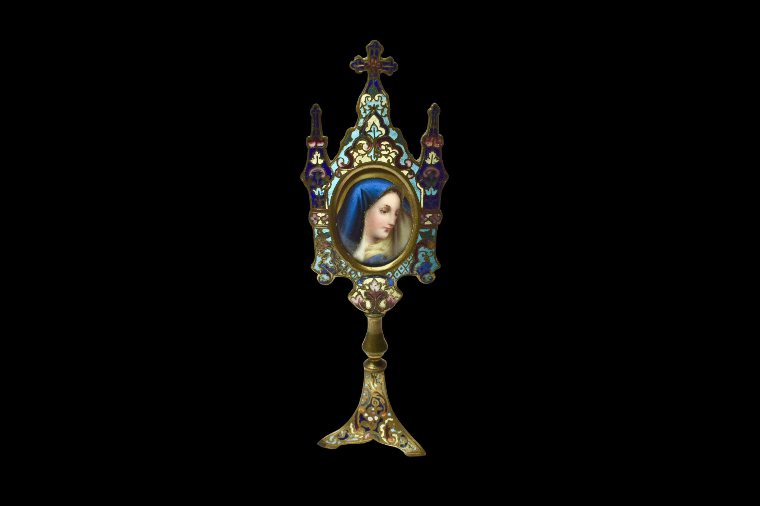 Een sierlijk Frans reliek houdertje uit het midden van de 19e eeuw, met een fijn geschilderd miniatuur portret van de Madonna. De omlijsting is rijk gedecoreerd met kleurrijke emaille, wat het geheel een decoratief effect geeft.